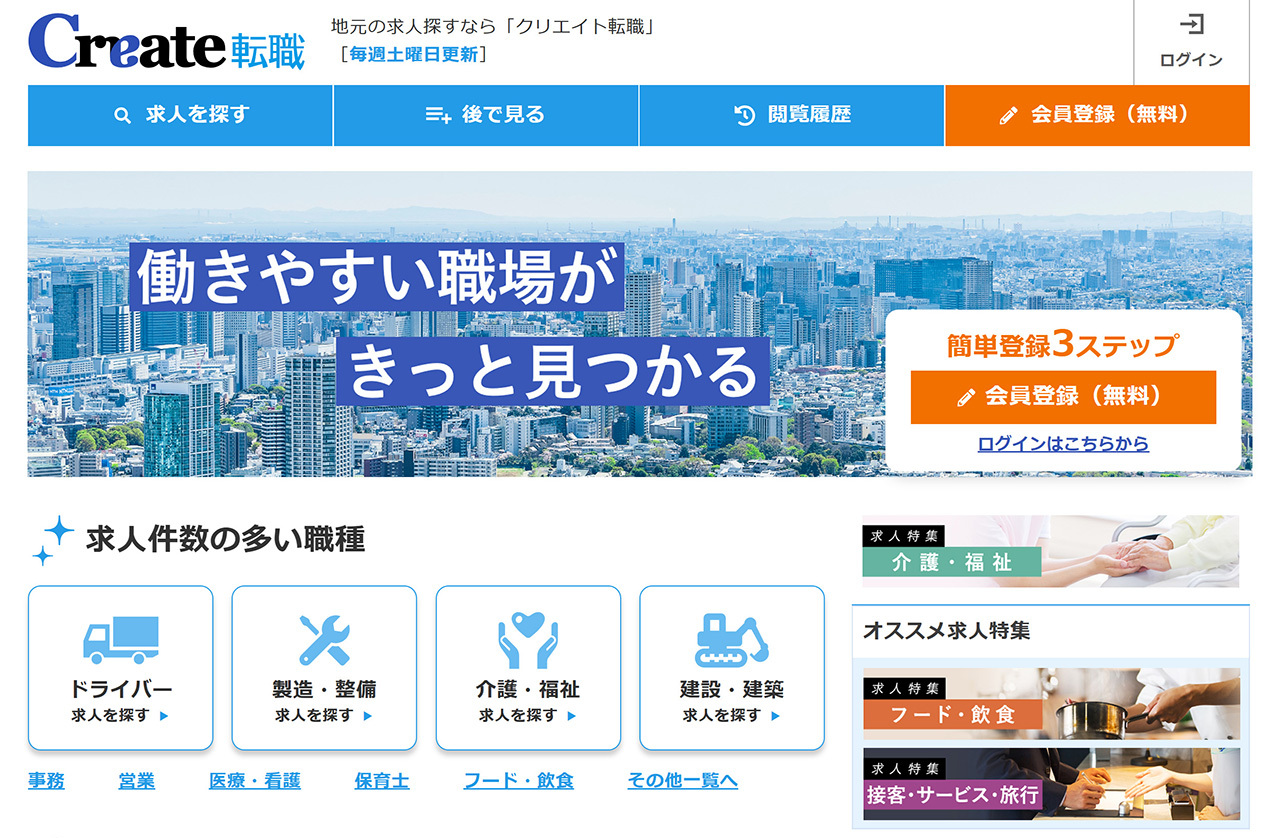 「クリエイト転職」は、株式会社クリエイトが運営する正社員求人情報に特化した転職サイトです。地域密着型の求人情報を提供し、求職者の多様なニーズに応えています。 主...