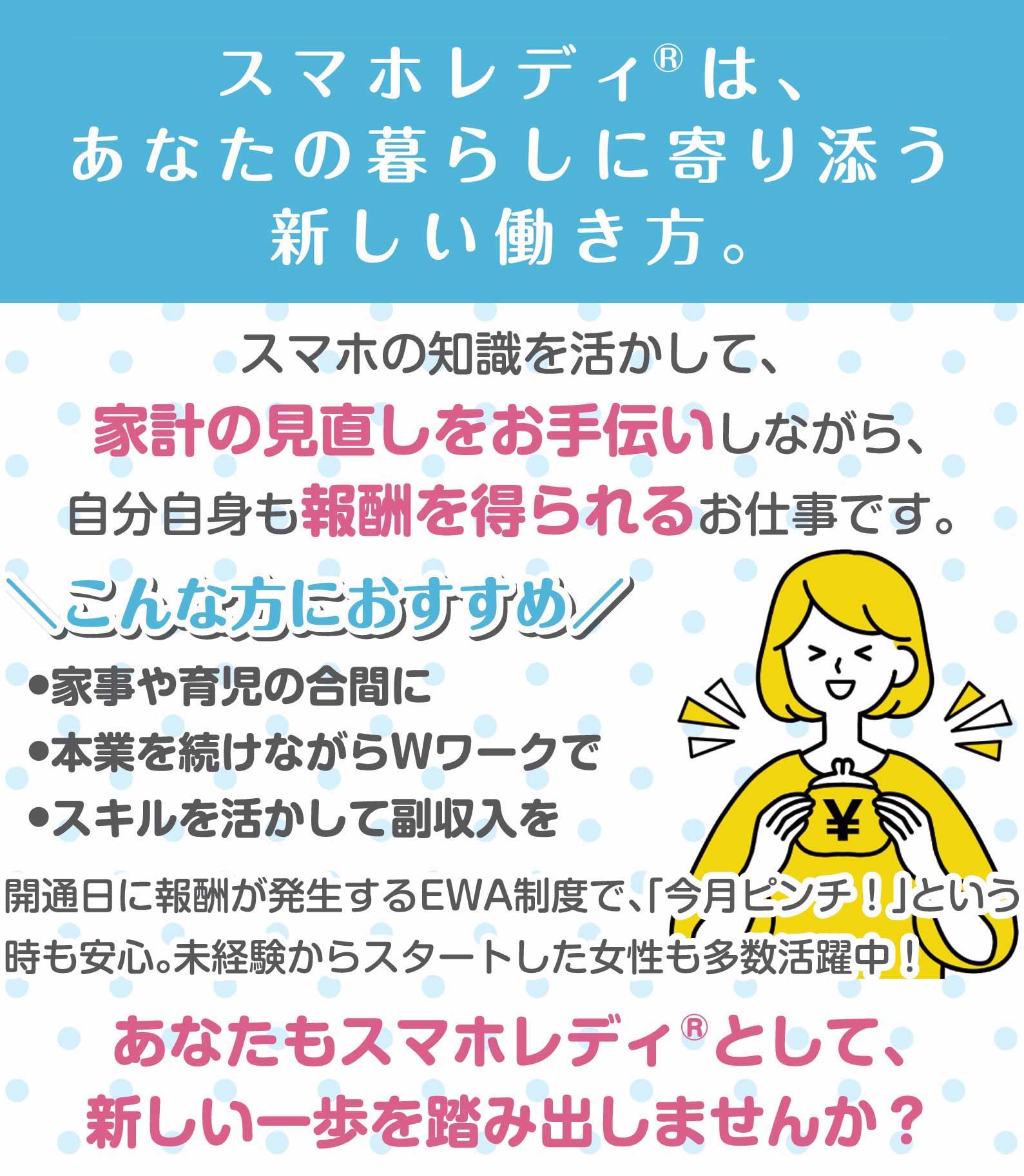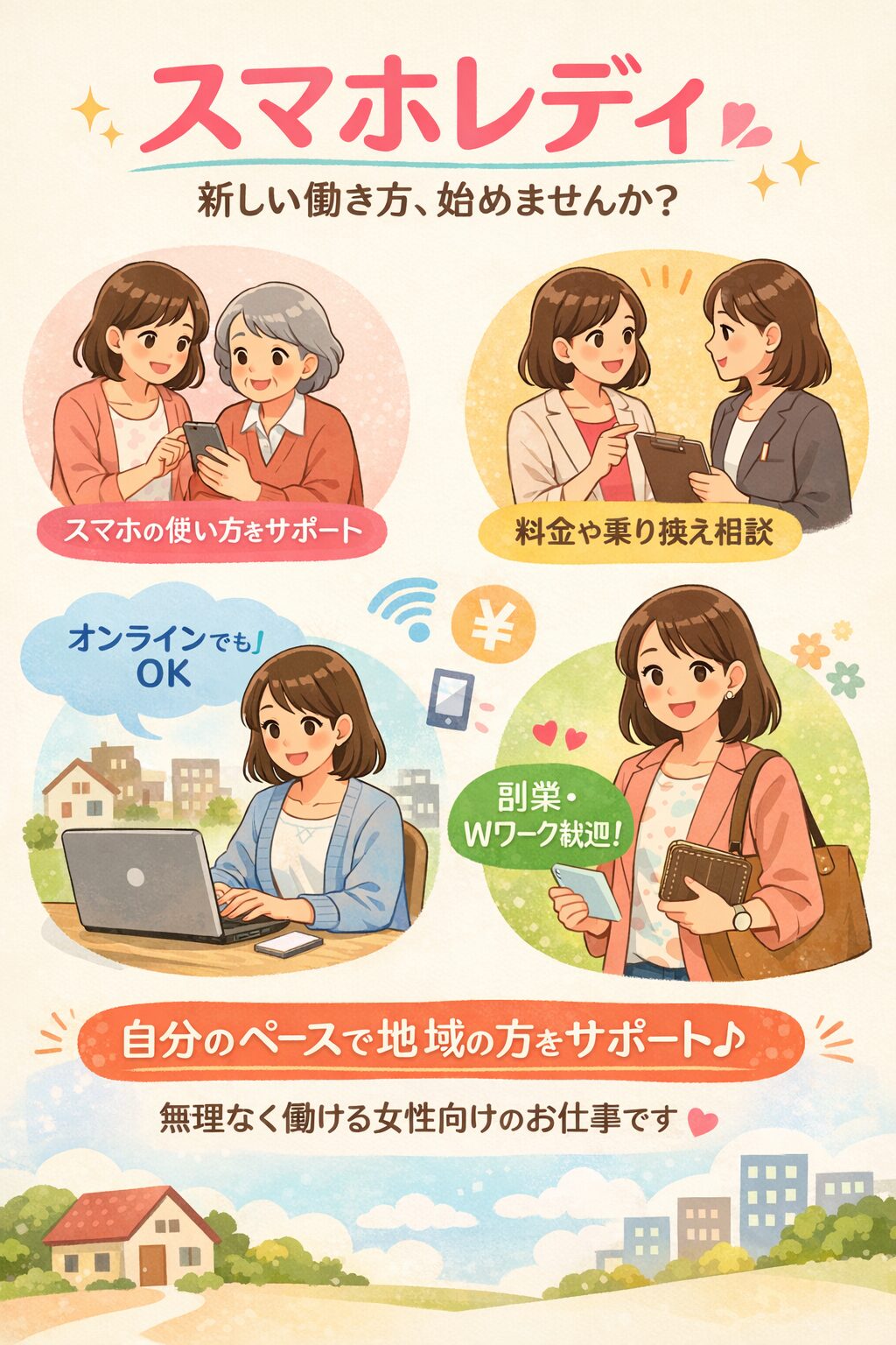 「スマホレディ」とは、主に女性が自分のペースでスマホの使い方サポートや料金プランの見直し、乗り換え相談などを行う、新しい働き方(通信代理店制度)のことで、副業やWワークにも適しており、ライフスタイルに合わせて活動できるのが特徴です。