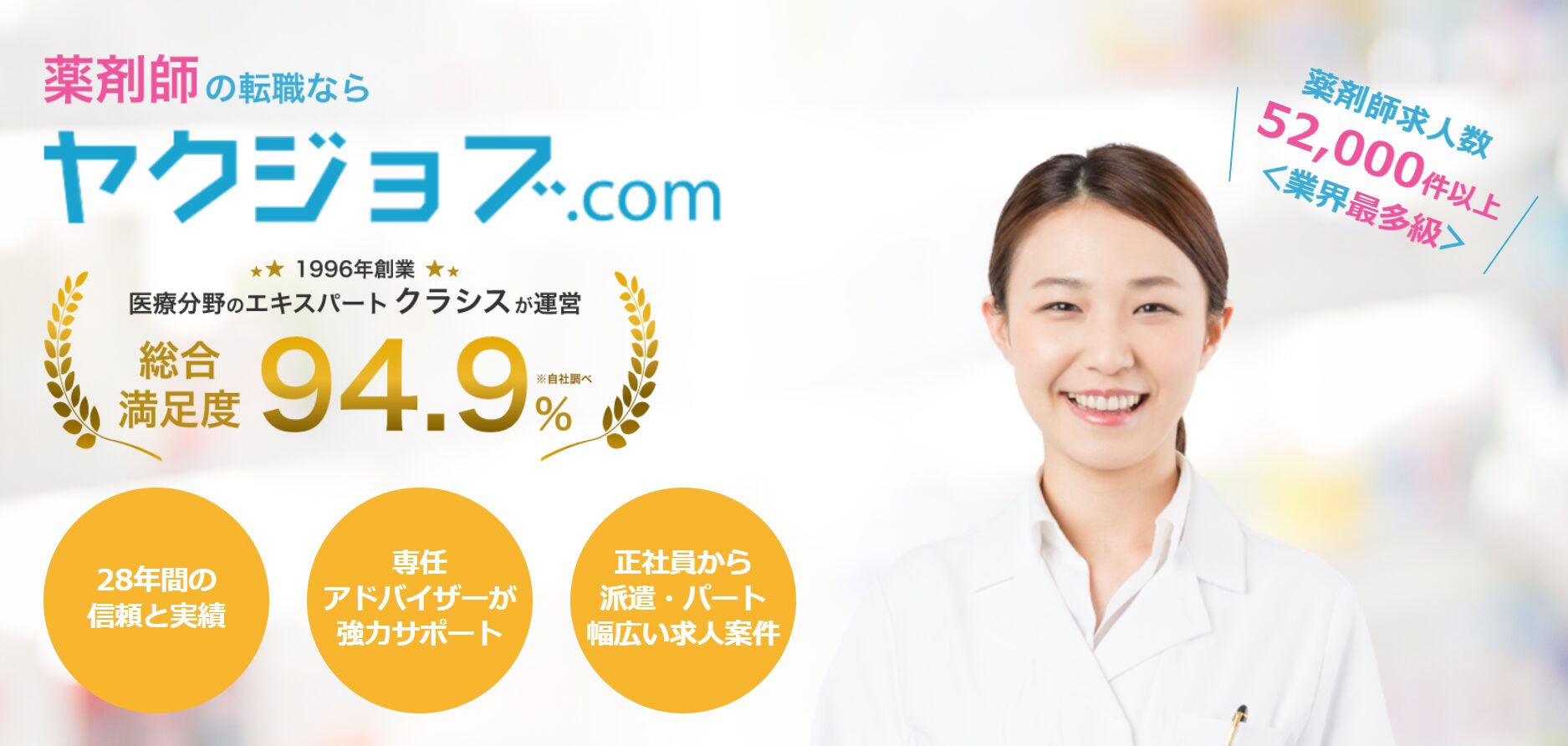 ヤクジョブとは、クラシスが運営する、25年以上の実績を持つ薬剤師に特化した人材紹介サービスです。正社員・派遣・パート、すべての雇用形態に対応しているので、働き方を迷っている方にもぴったりです。登録すると経験豊富なエージェントが担当として付き、書類作成から面接への同行、条件交渉や入社準備まで、一貫したサポートを提供してくれます。