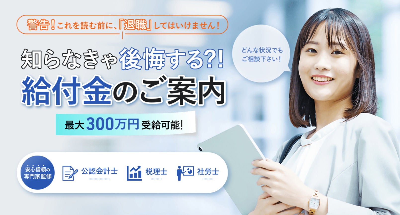 どの会社も「退職後に数百万円が受け取れる!」とホームページに記載されているため、「本当なのかな?」「怪しくないのかな?」と不安に感じる人もいるかと思いますが、申請する給付金は“国が認めている制度”ですのでご安心ください。