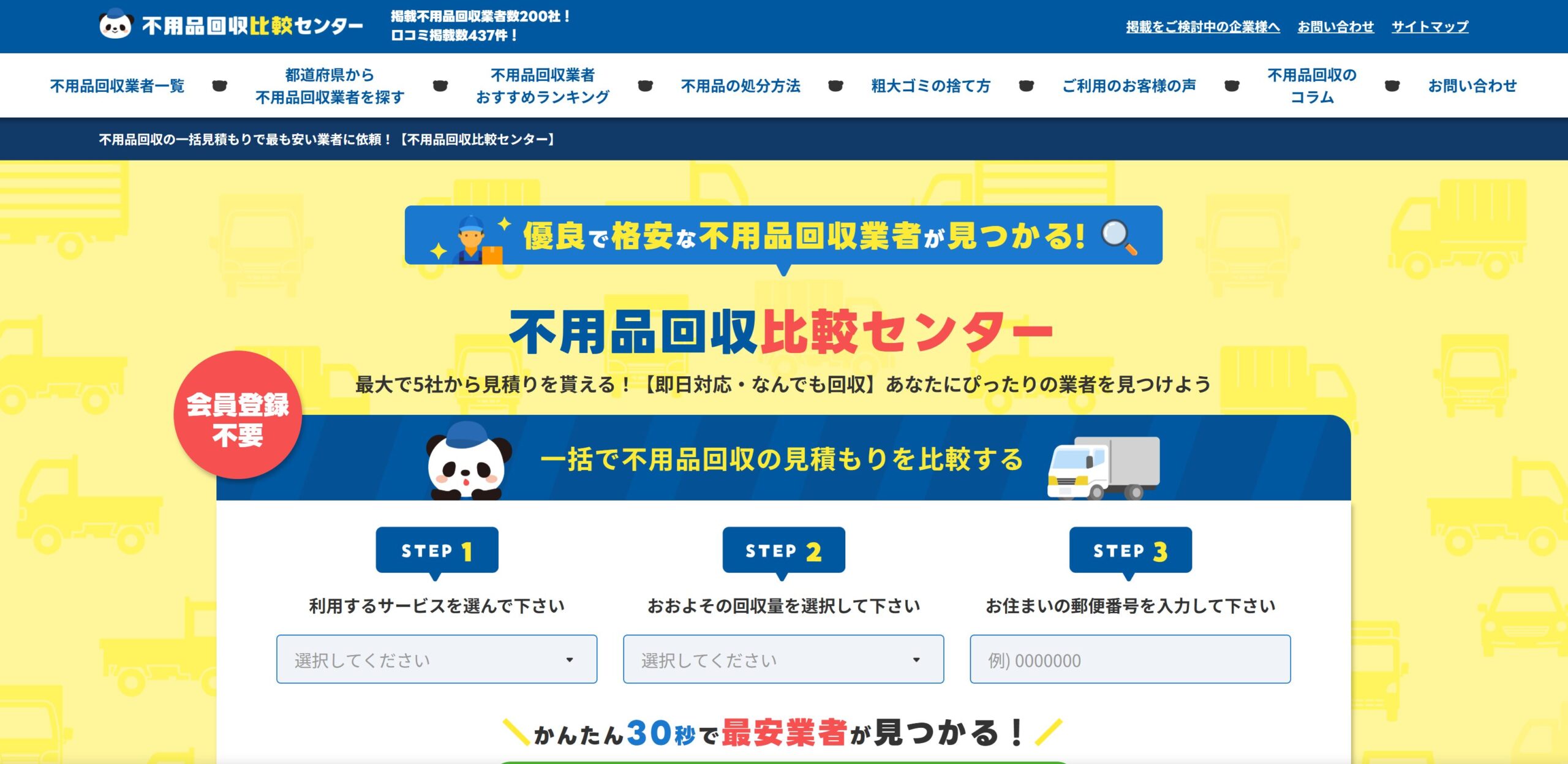 「不用品回収比較センター」は、家庭・オフィス問わず、不要になった家具・家電・雑貨などの不用品回収をはじめ、買取サービス/ゴミ屋敷清掃/遺品整理・生前整理までワンストップで対応していします。24時間365日受付・最短30分で駆けつける迅速対応が強みです。少量の片付けから一棟丸ごとの整理まで、定額パック料金プランを用意し、出張費・搬出費・階段料金などを含んだ明朗な料金体系で安心してご利用いただけます。