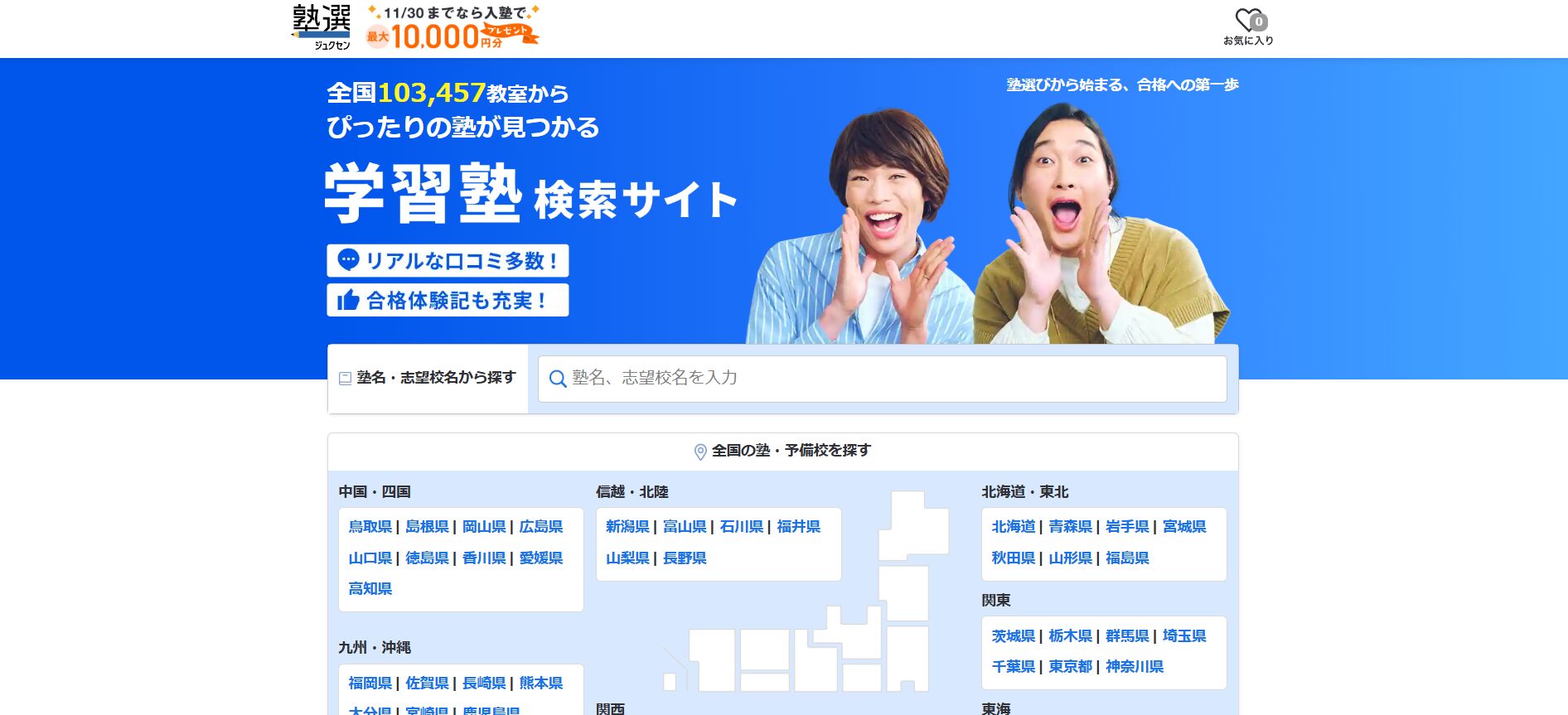 塾選(ジュクセン)は、日本全国10万教室以上の塾情報を掲載する、国内最大級の塾・学習塾検索サイトです。