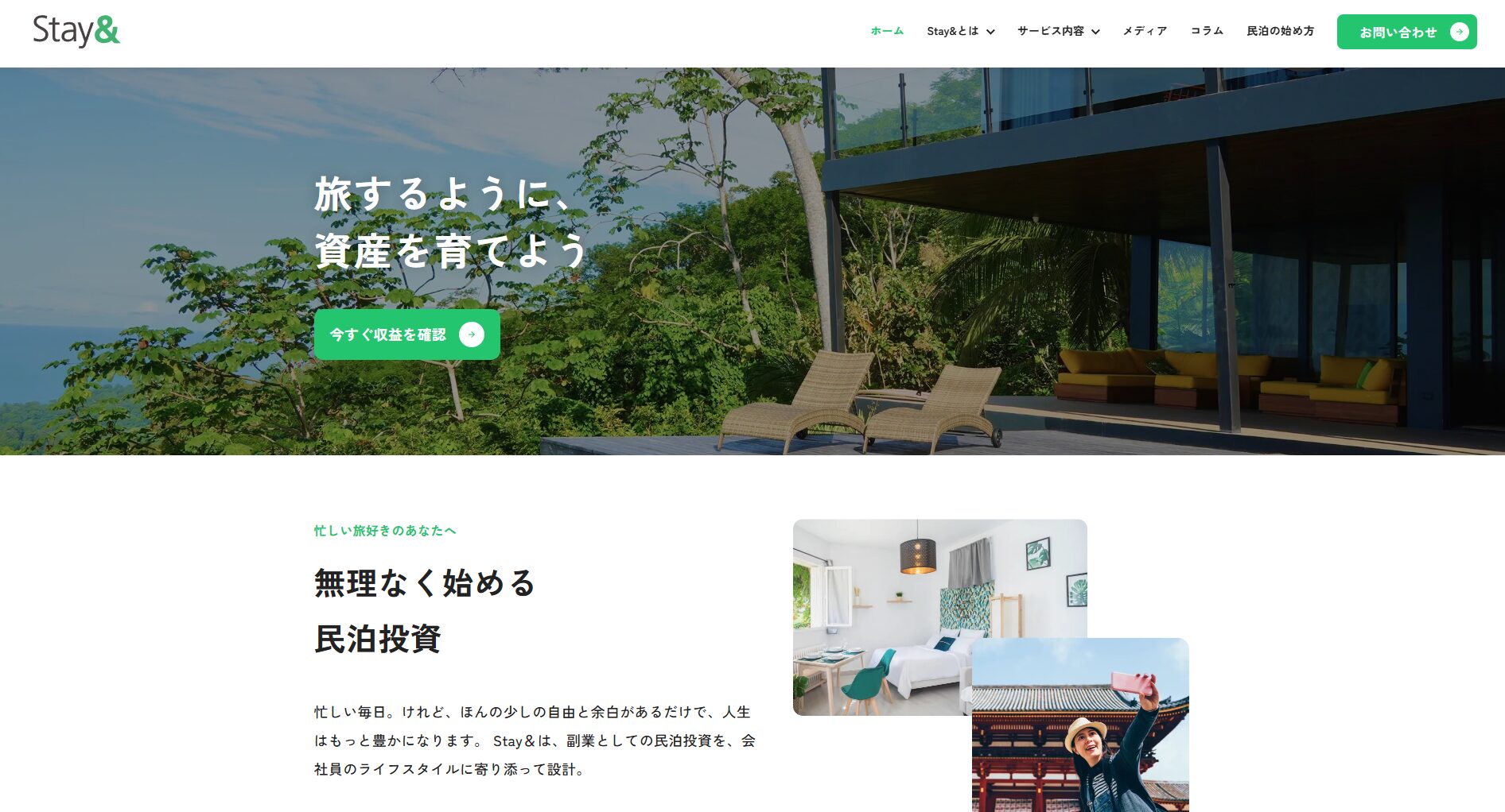 「STAY &」は、副業としての民泊運営を支援するワンストップサービスを提供しています。物件探しから融資支援、開業申請、インテリア設計、清掃・ゲスト対応代行まで民泊運営に必要なすべての工程を一括サポートしているのが特徴です。