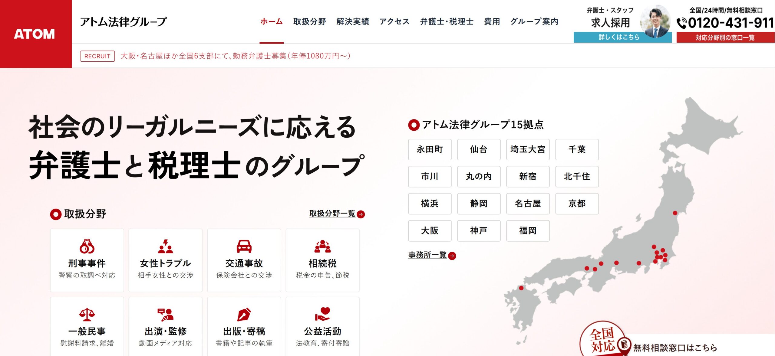 アトム法律グループは、全国15拠点を展開する総合リーガルサービス企業で、弁護士・税理士が交通事故、刑事事件、離婚・相続・一般民事など幅広い法律問題の相談・対応を行っています。無料相談から解決までを丁寧にサポートし、豊富な解決実績や専門家による情報発信も提供。また、データとAIを活用したコンテンツ生成やシステム開発を手掛ける関連会社もグループ内にあり、法律×ITの知見で社会のリー