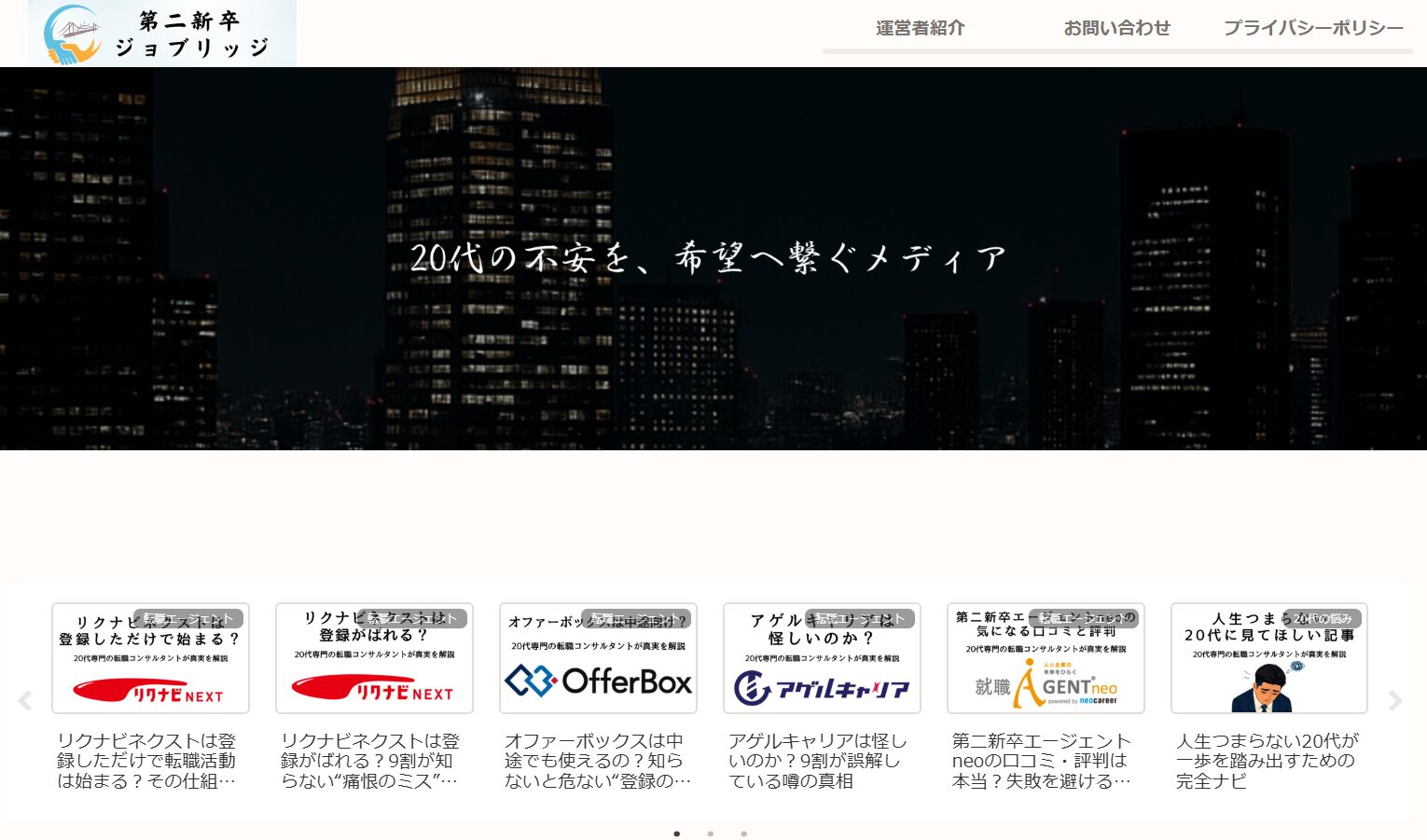 第二新卒ジョブリッジは、第二新卒・20代向けに特化したキャリア支援メディアです。 転職に不安を感じやすい時期だからこそ、「受からない理由」「失敗しない選択肢」「本当に使うべき転職サービス」を、実体験と一次情報をもとに分かりやすく解説しています。 第二新卒としての転職に悩んでいる方や、今の働き方に迷いを感じている20代の方に必見のメディアです。