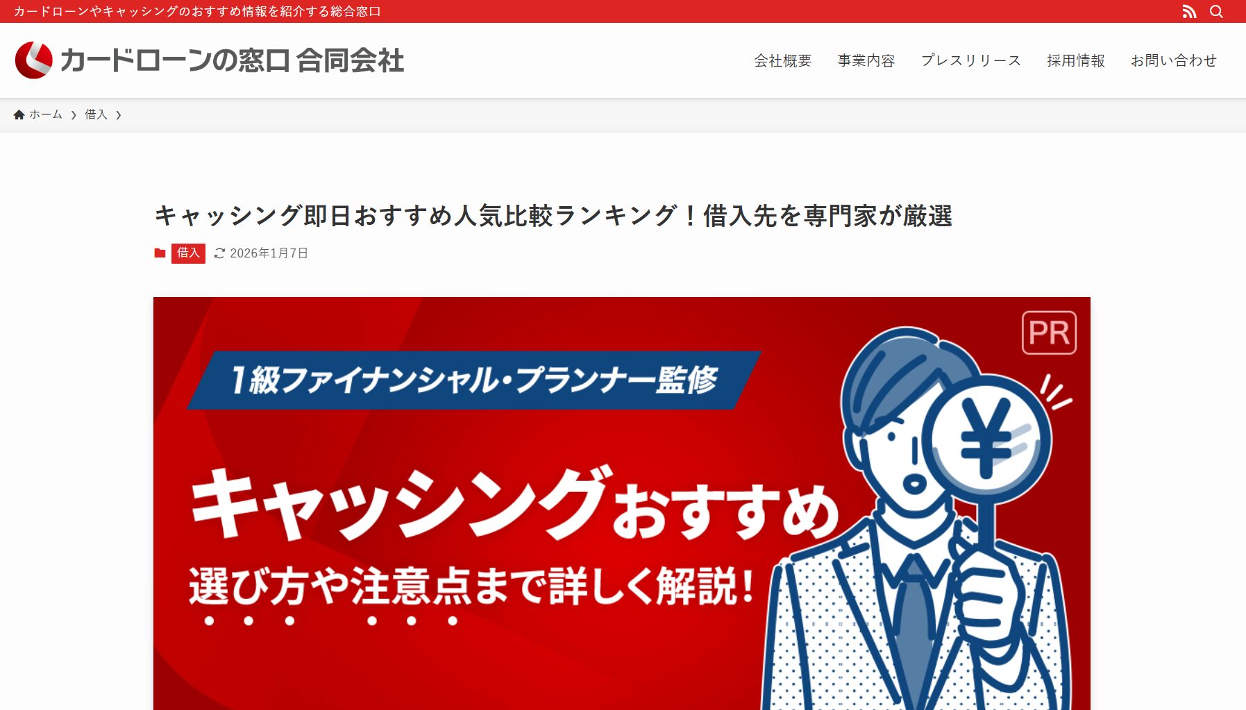 カードローンの窓口合同会社は、カードローンやキャッシングに関する情報を中心に、利用前に押さえておきたいポイントを分かりやすく整理している情報サイトです。 中でも「キャッシングおすすめ人気比較ランキング」では、各サービスの特徴や比較の視点をまとめており、検討時の参考情報として活用されています。